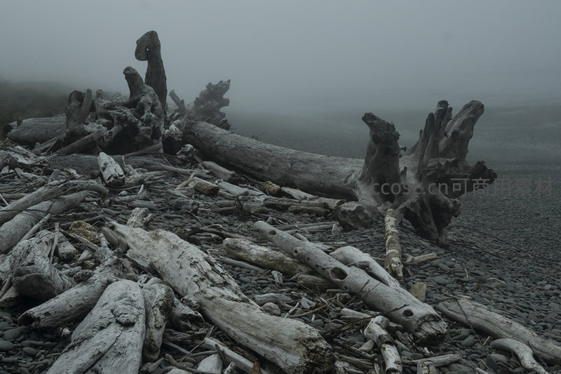 浓雾笼罩的海岸边,大量被海水冲刷的枯木散落在灰黑色石滩上,营造出一种苍凉而宁静的自然氛围。