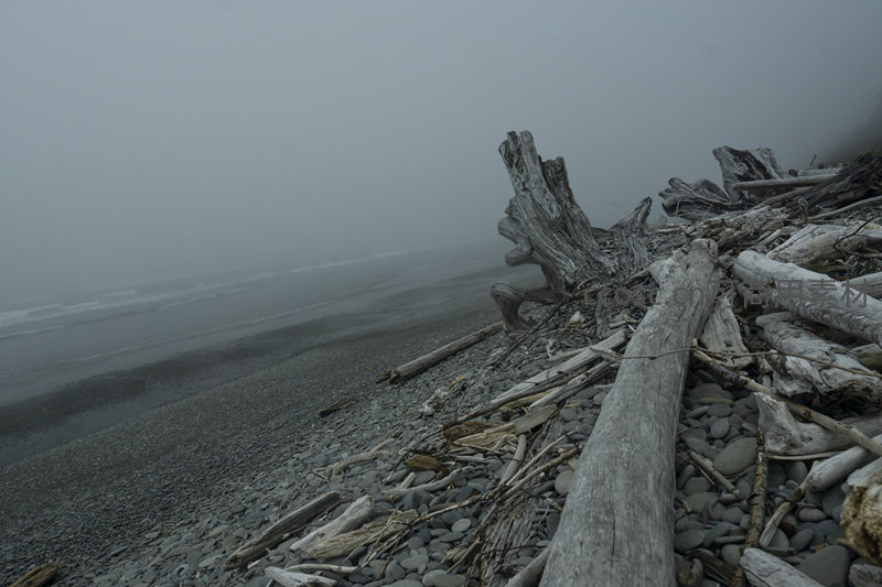 雾中海滩枯木与潮水低语