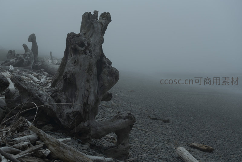 一块形态奇特的树根在浓雾中孤独地伫立于空旷海滩,仿佛一位沉默的守望者,凝视着无垠的远方,意境深远。