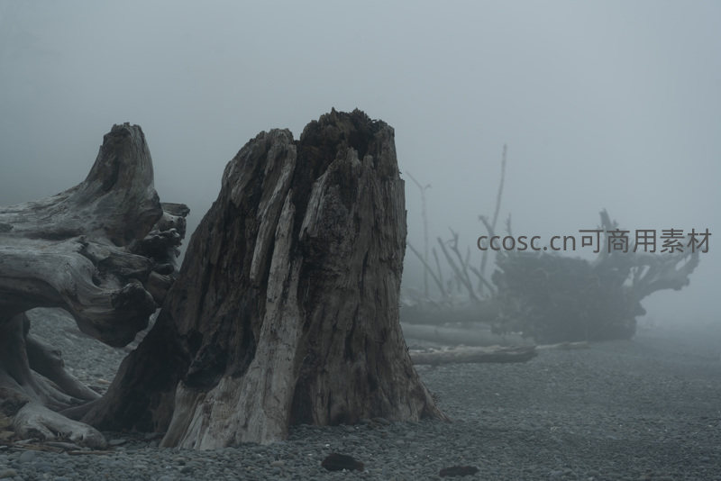 浓雾笼罩的海滩上,巨大的漂流枯木静静矗立,纹理斑驳,与灰白天空融为一体,营造出一种神秘而孤寂的氛围。