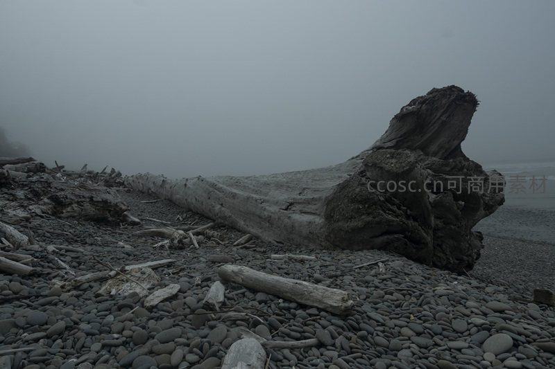 浓雾笼罩的海滩上,一根巨大的漂流木横卧在灰黑色的卵石滩上,周围散落着细小的枯枝,营造出一种静谧而苍凉的氛围。