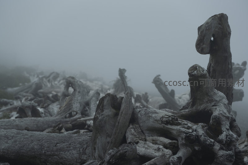 浓雾弥漫的林地中,无数扭曲的枯木堆积如山,形态各异,仿佛远古战场的遗迹,在寂静中诉说着时间流逝与自然的力量。