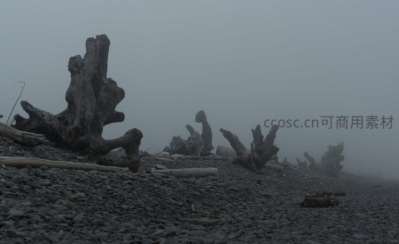 浓雾笼罩的海岸线上,形态各异的枯木散落在灰黑色鹅卵石滩上,营造出一种神秘、孤寂且充满故事感的自然景观。