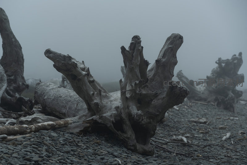 被海水和岁月雕刻的巨木根部,在迷雾中如同沉默的雕塑,其粗犷的纹理与柔和的雾气形成对比,展现自然的力量与美感。