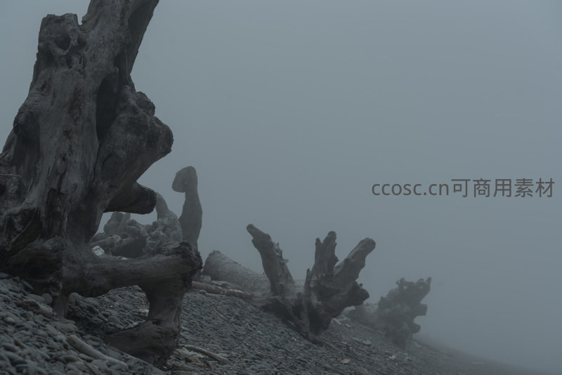 在朦胧的雾气中,一排排形态奇特的枯木沿着海岸线延伸,它们是时间流逝的见证者,为这片荒芜之地赋予了深邃的意境。