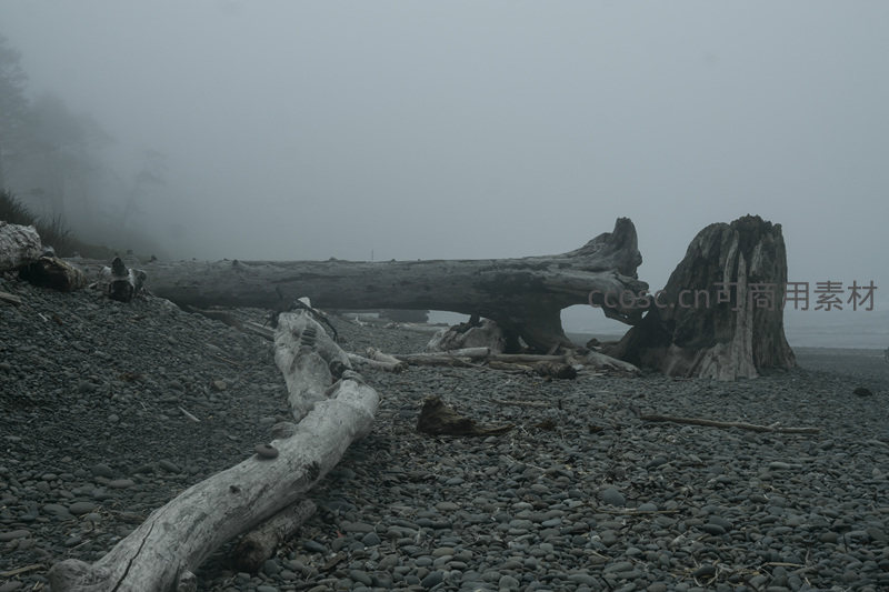 浓雾笼罩的海岸线上,巨大的枯木横卧在灰色卵石滩上,营造出一种神秘而孤寂的氛围,仿佛时间在此凝固。