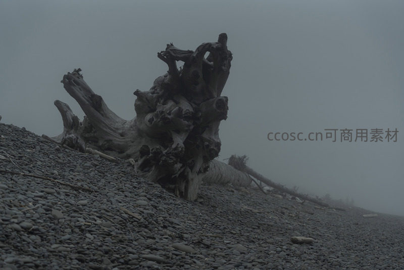 在浓雾的包裹下,一块形态扭曲的古老树根静静躺在石滩上,其粗糙的纹理和深邃的轮廓展现出自然的力量与沧桑。