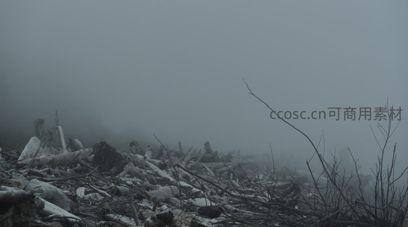 浓雾中堆积如山的枯木残骸,如同被遗弃的自然废墟,散发着荒凉与沉寂的气息,令人感受到大自然的无情与壮美。