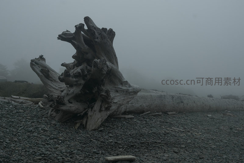 在弥漫的雾气中,一根形态奇特的巨大漂流木横陈于布满碎石的滩涂之上,其扭曲的枝干与灰蒙的背景融为一体,充满原始与孤寂感。