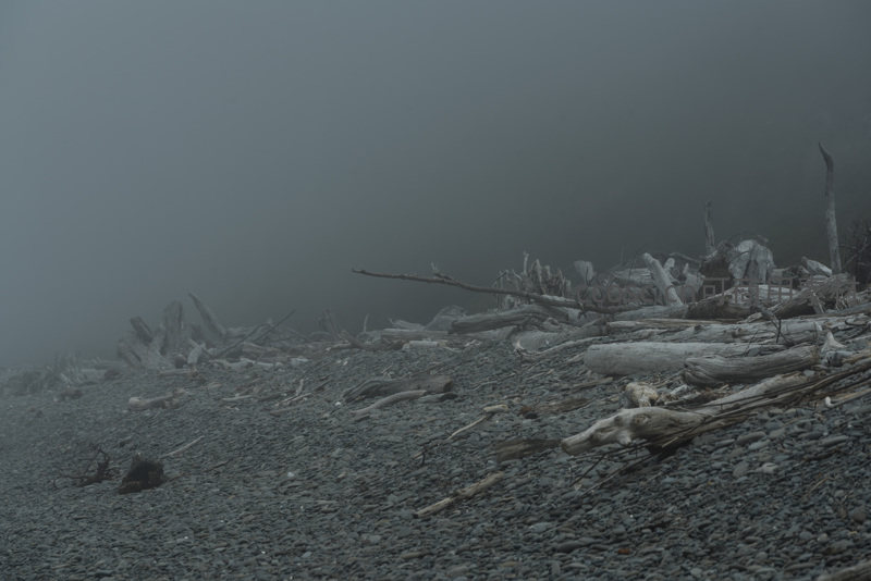 在一片灰蒙蒙的雾气中,布满碎石的海滩上堆满了形态各异的枯木残枝,整个画面色调单一却充满故事感,仿佛时间在此凝固。