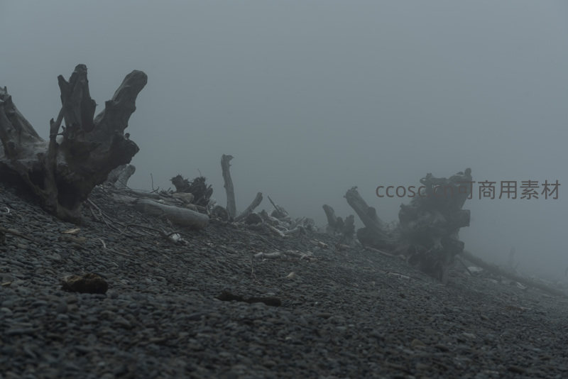 从低角度仰望,雾气弥漫的海滩上,几株造型奇特的枯木如雕塑般矗立,其扭曲的枝干在朦胧中更显张力与生命力。