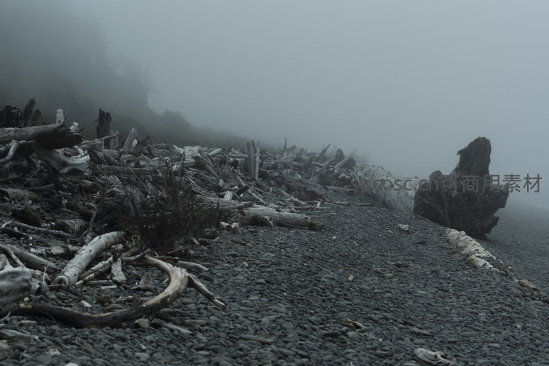 在弥漫的浓雾中,海滩上堆积着形态各异的漂流木,如同被遗忘的废墟,整个场景被灰暗的色调包裹,充满神秘与宁静。