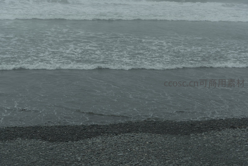 灰调海浪轻抚黑色卵石滩,节奏舒缓