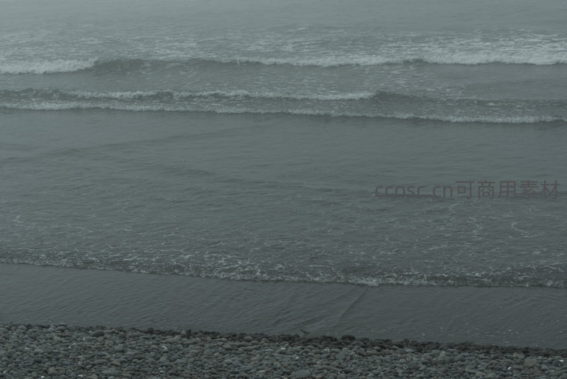 远处海浪连绵起伏,近处卵石滩在灰调光影下静默无声,画面层次分明,传递出广阔海洋与微小陆地间的和谐与宁静力量。