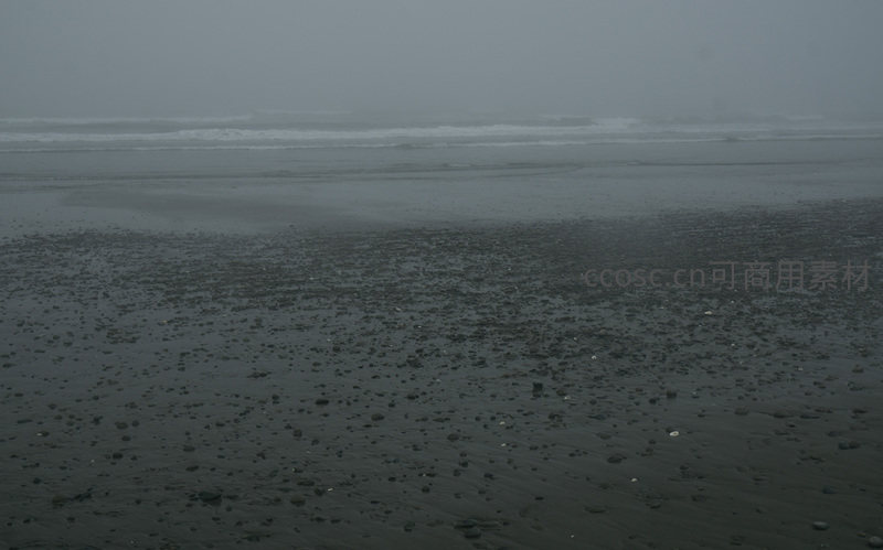 浓雾笼罩的海岸线,海浪在朦胧中拍打湿润的沙滩,灰色调的画面营造出一种静谧而神秘的氛围,仿佛时间在此刻凝固。