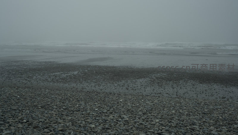 雾霭沉沉的海边,潮水退去留下斑驳印记