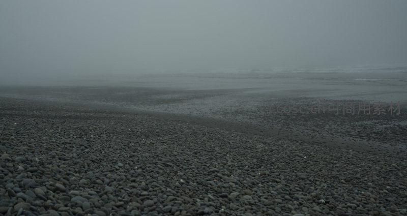 浓雾笼罩的海岸线,湿漉漉的卵石滩延伸至远方,海浪轻拍岸边,天地一色,营造出空灵而孤寂的氛围。