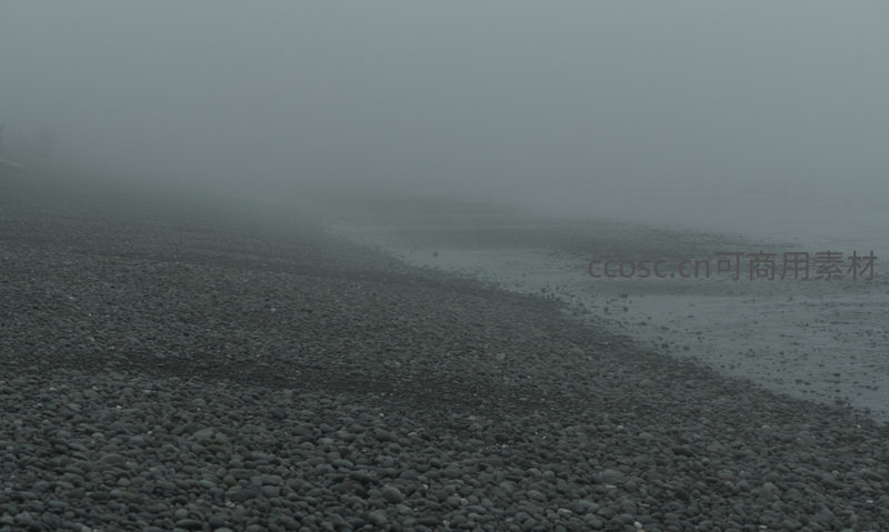 薄雾轻笼的石子滩上,水流蜿蜒如带,远处海浪若隐若现,整个画面充满诗意与禅意,令人沉思遐想。