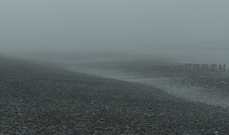 浓雾将天地融为一体,只有近处湿漉漉的黑色石滩清晰可见,远处的海天界限消失,呈现出一种苍茫、辽阔而又寂静的自然之美。