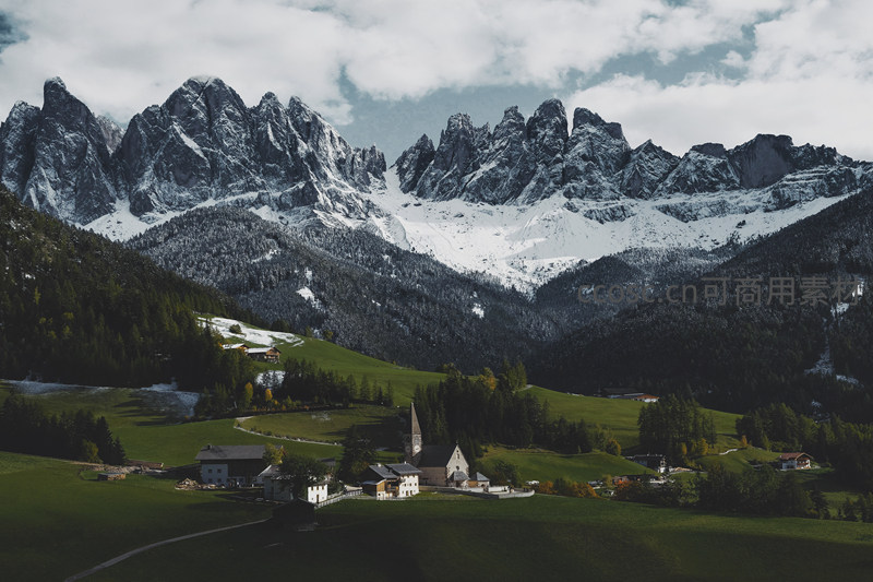 雄伟的雪山群峰环抱着一片翠绿的山谷,山谷中散落着几座房屋和一座尖顶教堂,构成一幅宁静祥和的欧洲乡村画卷,令人向往。