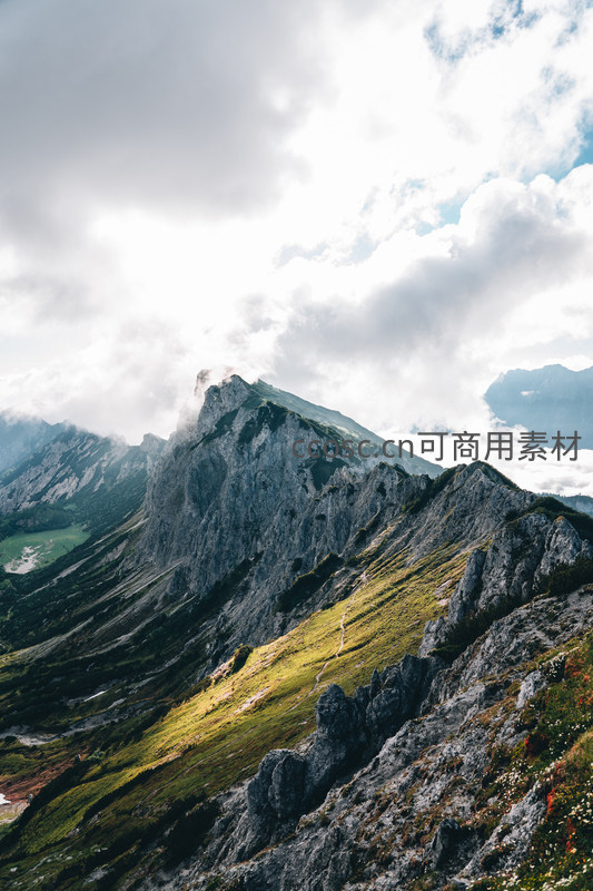 巍峨山峰在云海中若隐若现,阳光洒落于青翠山坡,崎岖岩壁与柔美云雾交织,展现大自然的壮丽与宁静。