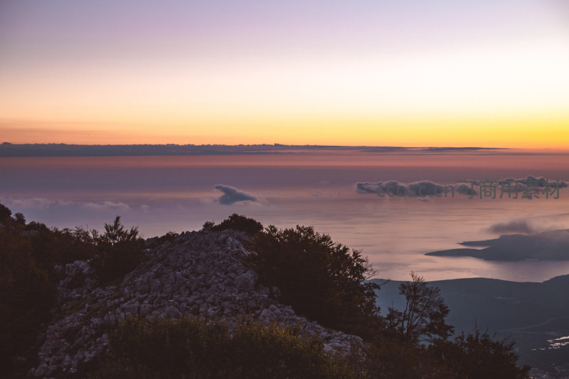 从山顶俯瞰,云海如绸缎般铺展至天边,夕阳将天空染成梦幻的紫橙色,远处岛屿若隐若现,构成一幅宁静而壮阔的自然画卷。