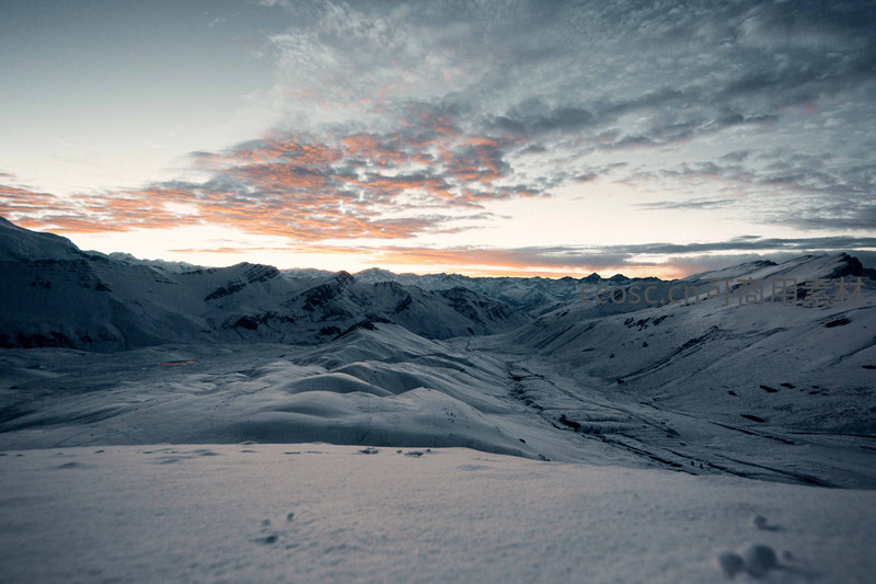 广阔的雪域山谷在黎明时分苏醒,天边云霞燃烧着橙红的光芒,覆盖着皑皑白雪的群山连绵不绝,展现出大自然无与伦比的雄浑与寂静。