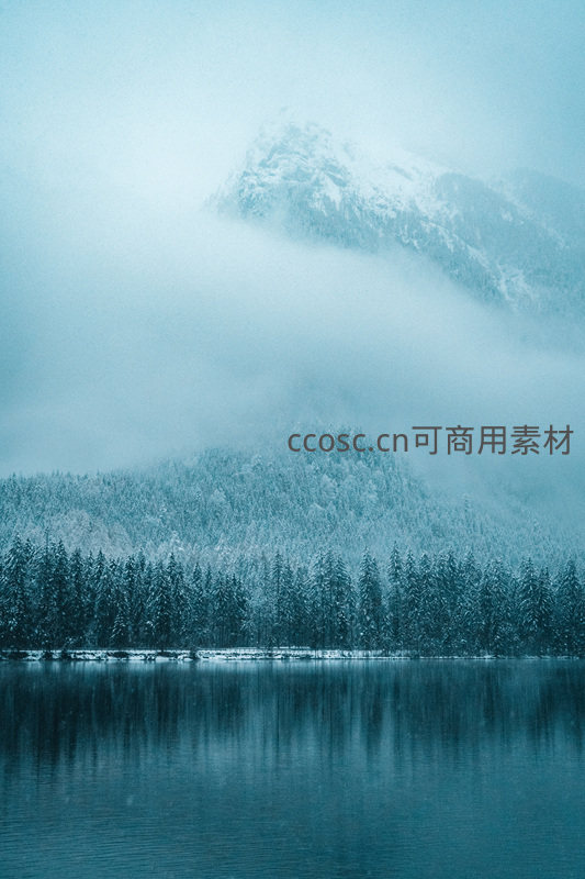 白雪覆盖的山峰隐于云雾之间,湖面如镜映照着苍翠松林与山峦,整个画面呈现蓝调静谧感,令人心旷神怡。