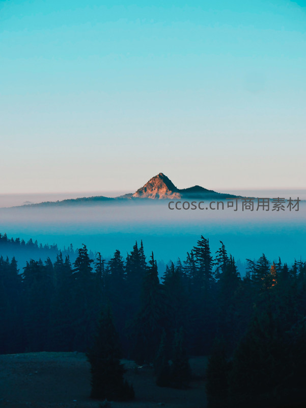 浓雾如纱笼罩山林,远山峰顶被晨光染成金红,近处深绿针叶林沉默伫立,冷暖色调交织,营造出神秘空灵的氛围。