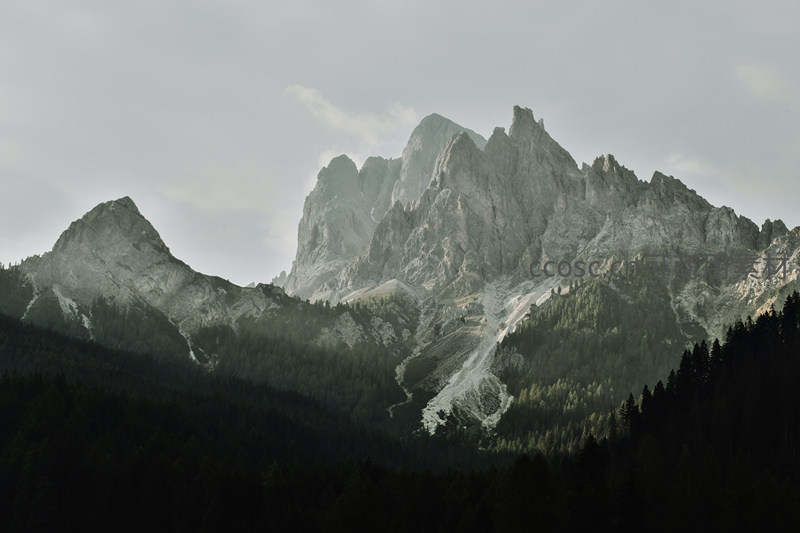 厚重的云层低垂,为连绵起伏的灰白色山峦披上了一层神秘面纱,山脚下是浓密深绿的针叶林带,整个画面色调沉郁而富有层次,传递出一种庄严、静谧的自然之魂。