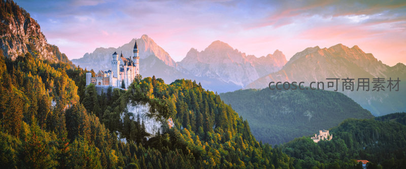 一座宏伟的白色古堡矗立在翠绿山林之巅,背景是连绵起伏的雪山和绚丽的晚霞,构成一幅如梦似幻的童话画卷。