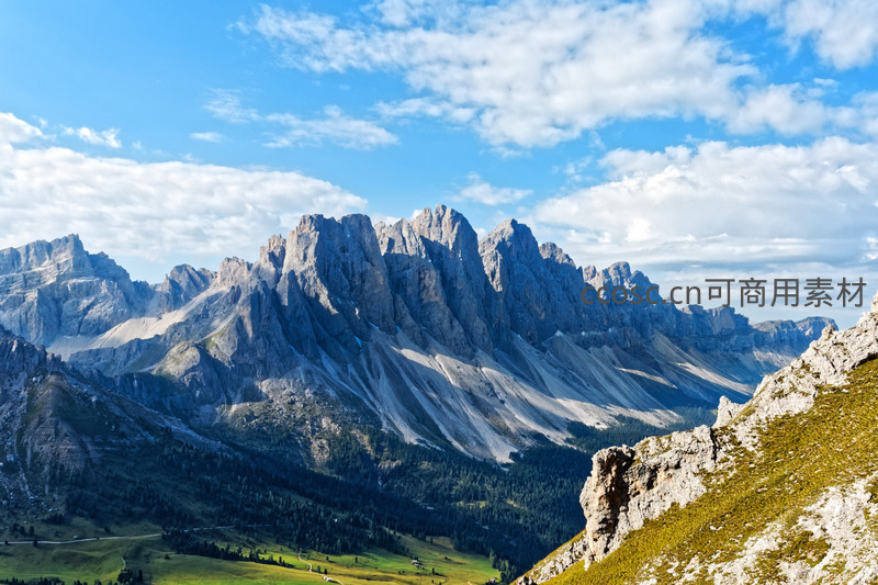 锯齿状的石灰岩山峰直插云霄,山谷间点缀着翠绿草甸和松林,蓝天白云下尽显阿尔卑斯南麓的雄浑与宁静之美。