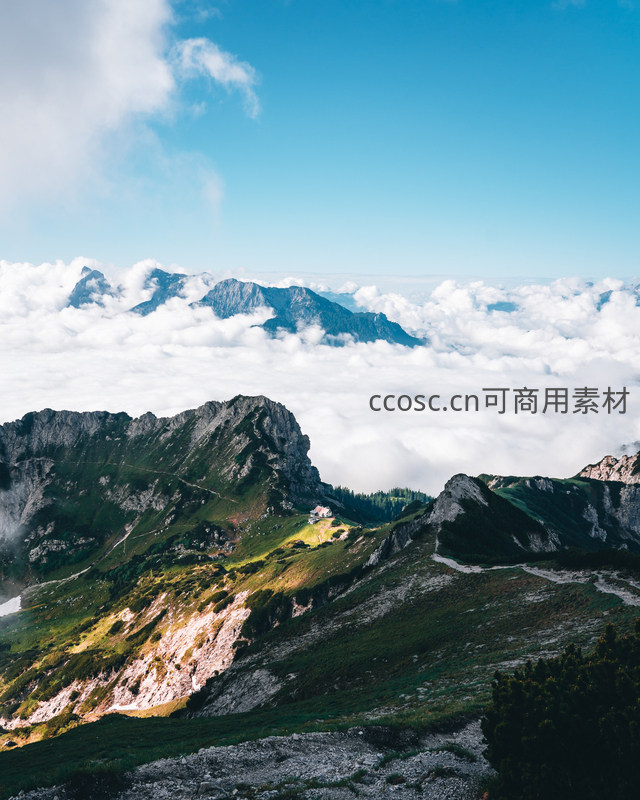 站在山巅俯瞰,脚下是无垠的云海,远处山峦隐约可见,一座孤寂小屋静卧于青翠山坡之上,仿佛通往天堂的驿站。