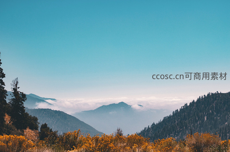 连绵起伏的群山被洁白云海温柔环绕,近处金黄灌木与苍翠松林相映成趣,天空湛蓝如洗,静谧而壮美。