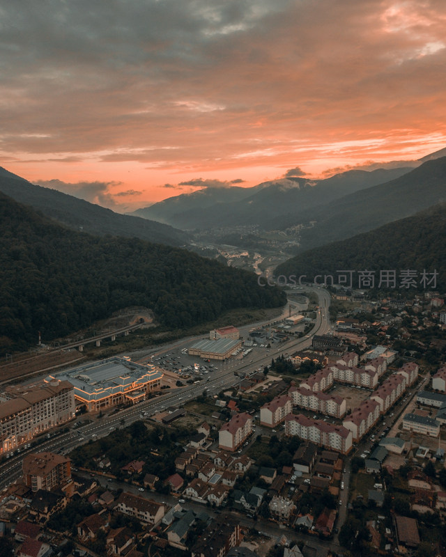 从高空俯瞰,夕阳将云层染成橙红色,山谷中的城镇、蜿蜒公路与铁路清晰可见,现代建筑与自然山峦交融,展现独特的地理人文风貌。