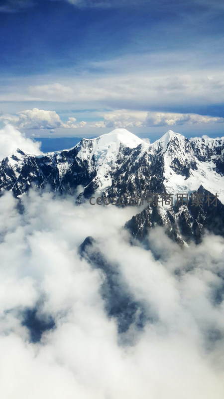 从高空俯瞰,连绵的雪山峰顶刺破云层,洁白的雪冠与翻腾的云海形成强烈对比,展现了大自然的雄伟与纯净。