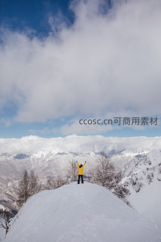 身着亮黄外套的人立于白雪覆盖的山巅,双臂高举迎向蓝天白云,身后是无垠云海与连绵山脉,象征征服与自由。