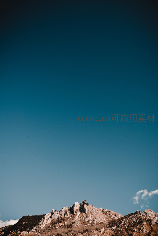 在纯净无垠的蓝天下,一座嶙峋的山峰静静矗立,展现着大地的原始力量与旷野的静谧之美。