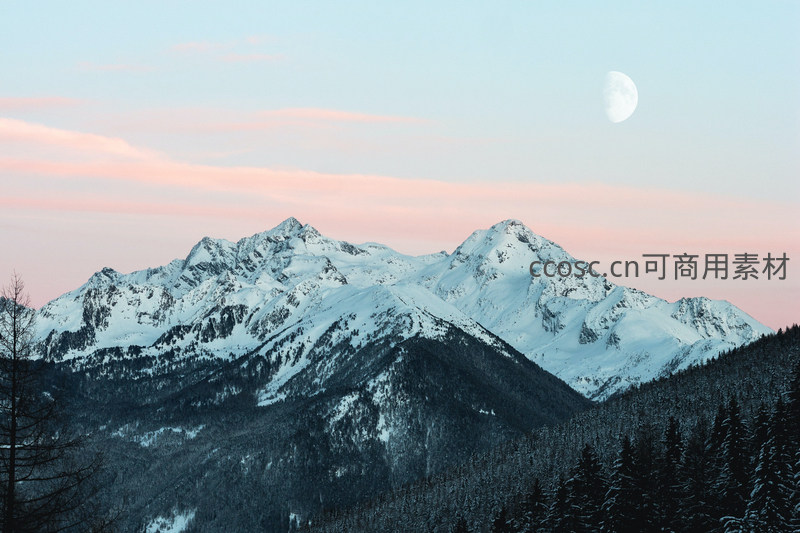 夕阳余晖染红天边云彩,皎洁明月已悄然升起,巍峨的雪山与苍翠的针叶林在柔和光线下显得格外宁静而壮美。