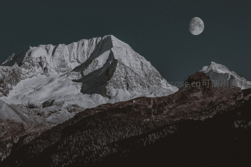 在深邃的夜空下,一轮满月静静悬于雪峰之巅,清冷的月光勾勒出山峦的峻峭轮廓,营造出一种肃穆而孤寂的崇高美感。