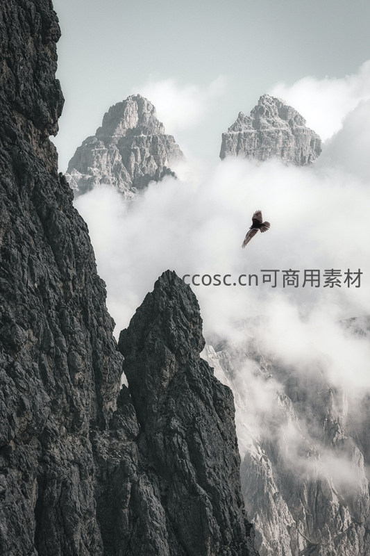 一只雄鹰振翅飞越翻腾的云海,在陡峭嶙峋的岩壁与隐现的山峰间自由翱翔,展现出大自然的磅礴气势与生命的无畏力量。