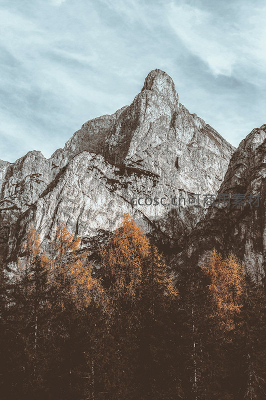 灰蓝色的天空下,一座陡峭的岩石山峰拔地而起,山脚下金黄的落叶松林与深绿的常青树交织,冷峻的色调中透出秋日的独特韵味。
