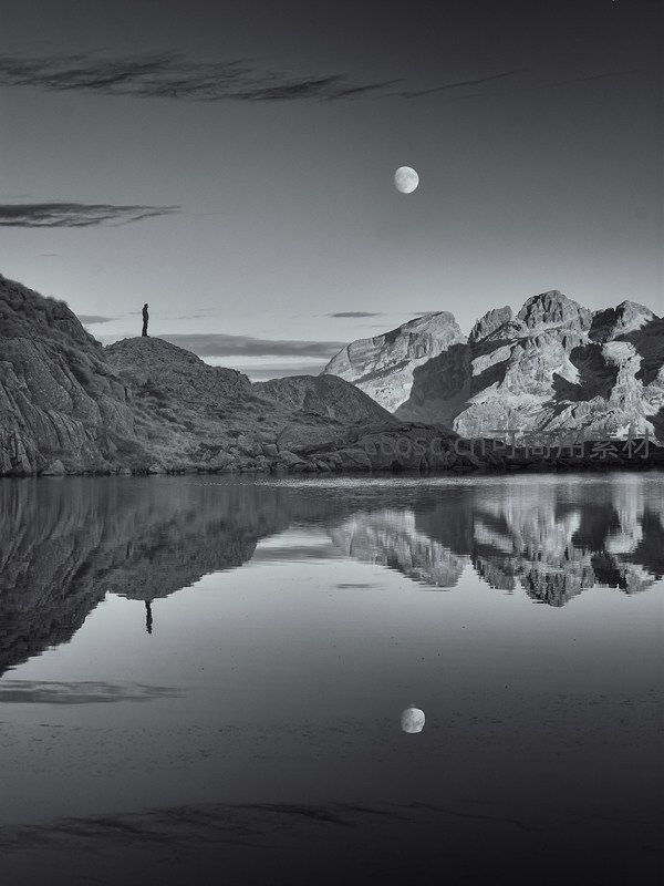 黑白影像中,一轮明月高悬,湖面如镜般倒映着山峦与人影,营造出深邃、孤寂而诗意的夜晚氛围。