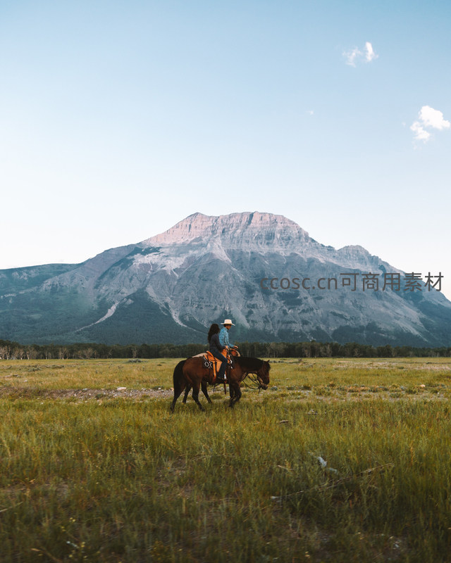 两人并肩骑马漫步在辽阔的草地上,背后是高耸入云的岩石山峰,蓝天白云下尽显自由与宁静的田园牧歌生活。