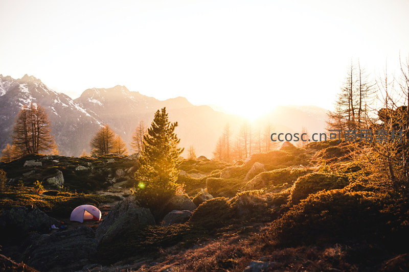 金色余晖笼罩着高山草甸与稀疏松林,一顶小帐篷安放其中,营造出宁静致远、远离尘嚣的野外露营氛围,令人向往。