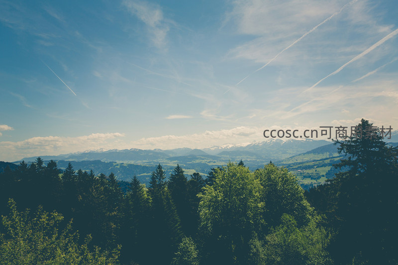 湛蓝天空飘着丝丝缕缕的飞机云,前景是茂密的深绿森林,远方连绵起伏的青山顶着皑皑白雪,构成一幅宁静开阔的田园山水画卷。