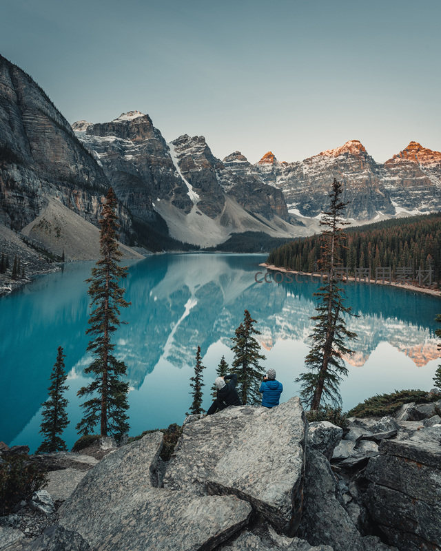 两人静坐湖畔岩石之上,凝望眼前如镜面般清澈的湖水,完美倒映着雄伟的雪山和橙红霞光,松树点缀其间,画面充满诗意与宁静。