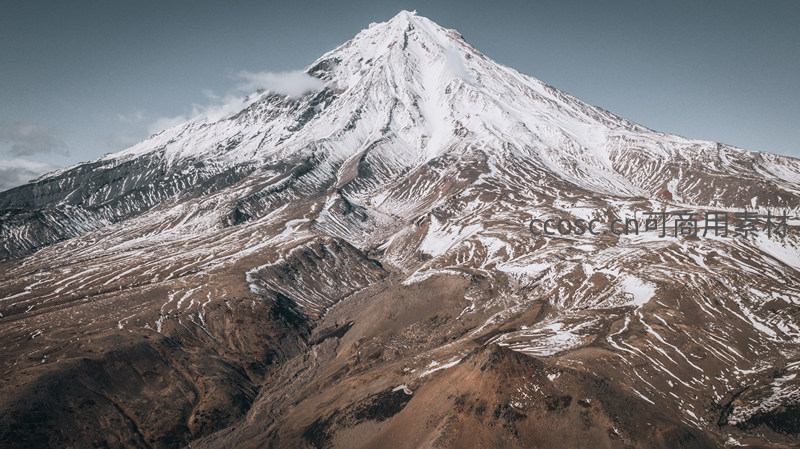 巨大的火山锥被白雪覆盖,山体沟壑纵横,裸露的岩土与残雪交织,展现出地质变迁的痕迹与大自然的原始力量。