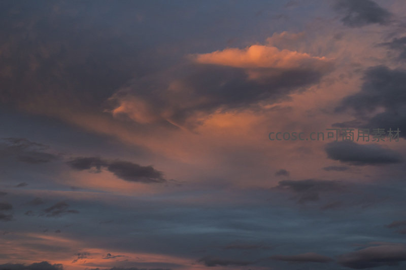 深蓝与橘红交融的天空中,云朵缝隙透出温暖光线,如舞台聚光灯般照亮局部云层,营造出神秘梦幻的氛围,充满视觉张力。