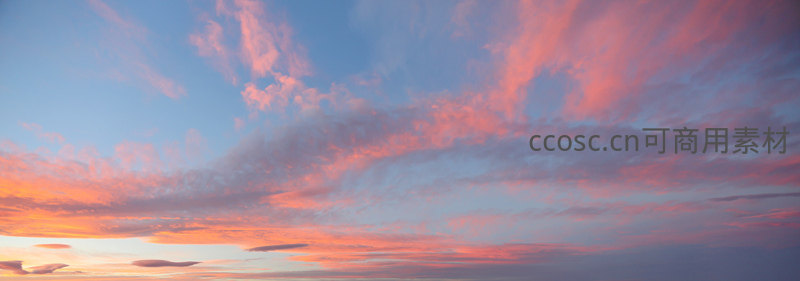 全景视角下,整片天空被燃烧般的晚霞填满,粉、橙、蓝三色交织,云朵如丝绒般柔滑飘逸,营造出一种宏大而梦幻的视觉盛宴。
